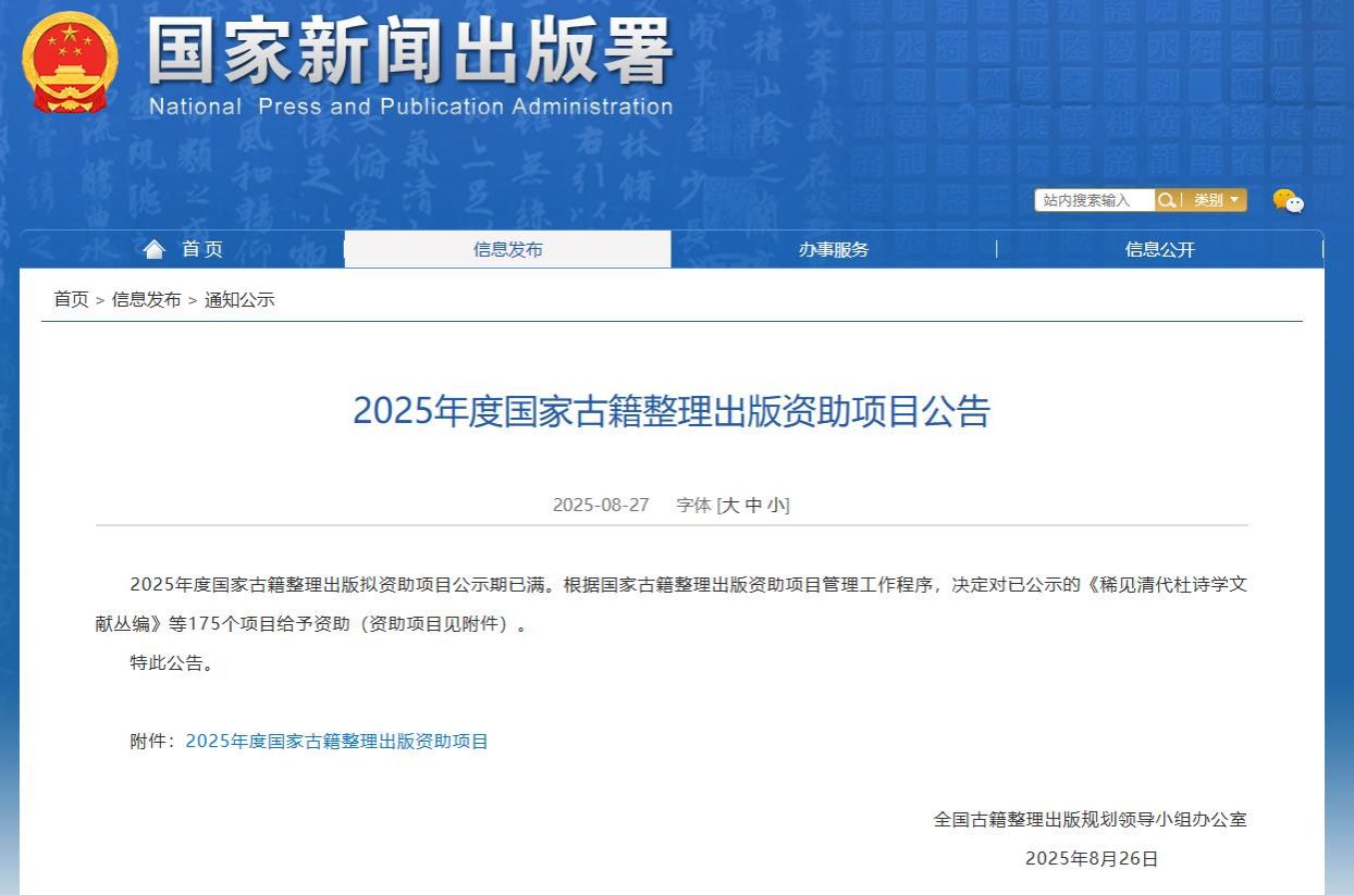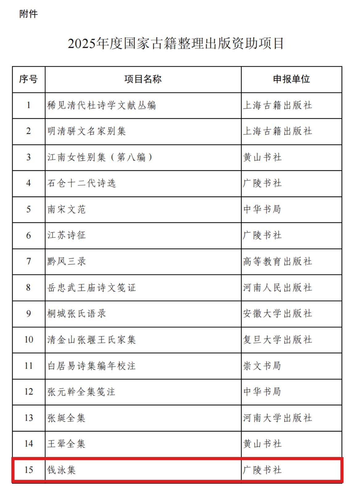 8月26日,全国古籍整理出版规划领导小组办公室正式公布了《2025年度国家古籍出版资助项目公告》,本年度共资助175项,我校文学院马振君副教授主持的《钱泳集》整理项目成功获得资助。