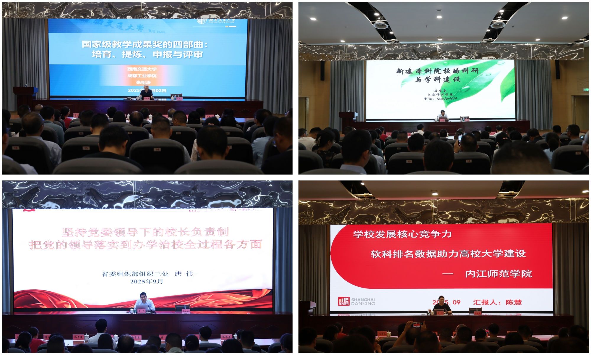 会议特邀省委组织部组织三处副处长唐伟、成都工业学院副校长张祖涛、成都师范学院副校长唐安奎、上海软科教育信息咨询有限公司陈慧博士作专题培训。四位专家分别围绕“坚持党委领导下的校长负责制,把党的领导落实到办学治校全过程各方面”“国家级教学成果奖的培育与申报”“新建本科院校科研与学科建设”“高校核心竞争力提升策略”等主题进行深入讲解,为学校内涵发展提供宝贵借鉴。