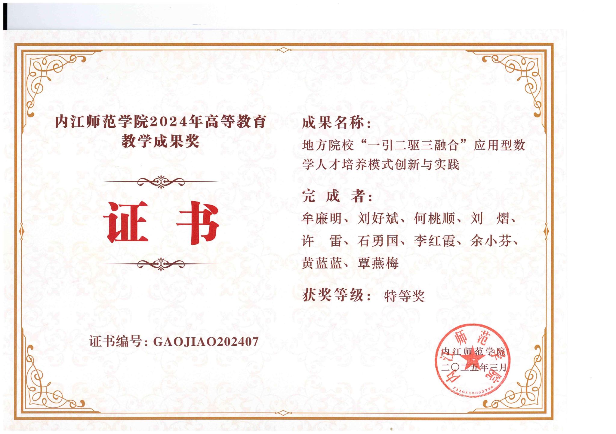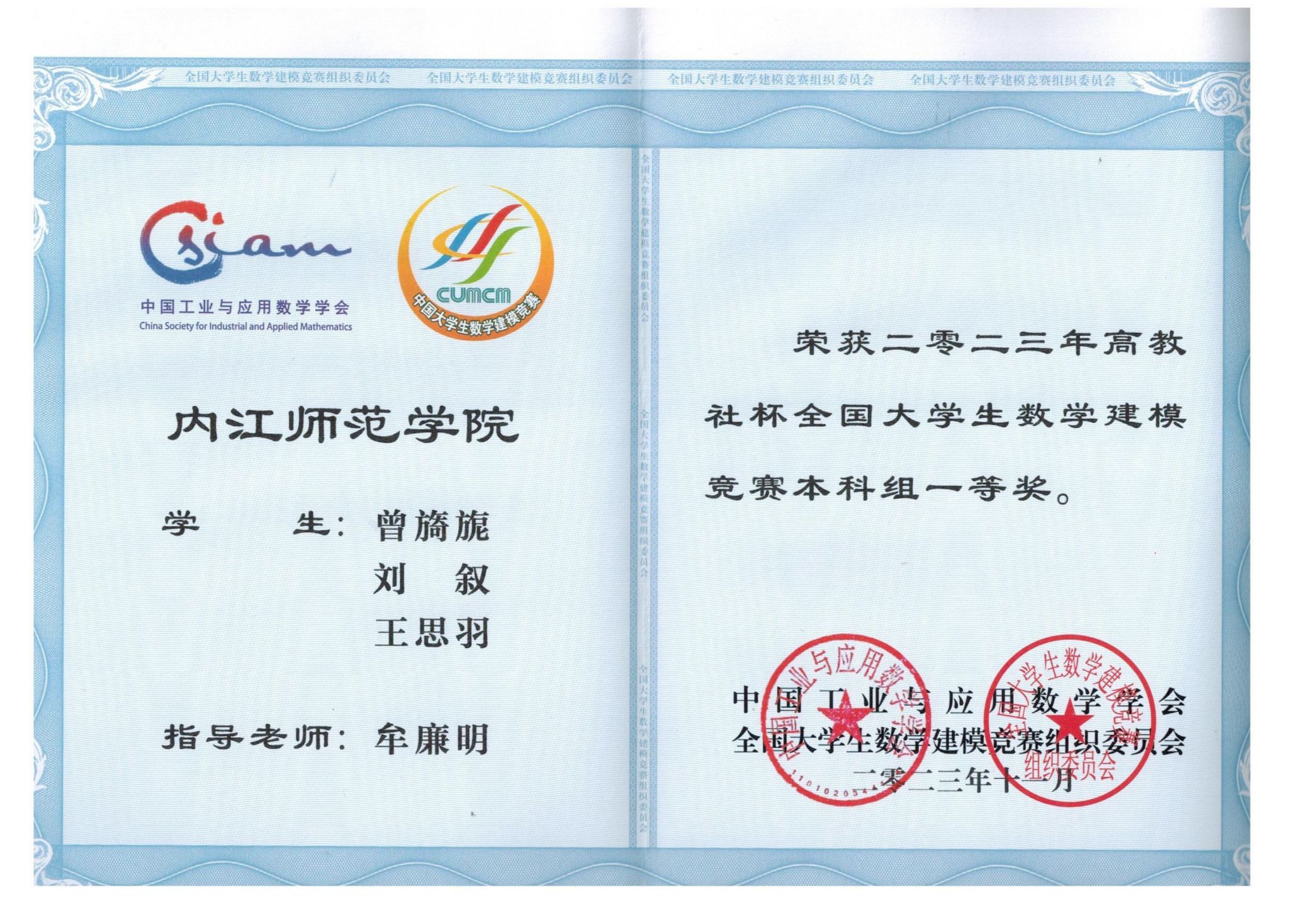 2020年,团队指导学生完成的论文获评“全国大学生数学建模竞赛优秀论文奖”,相关事迹获四川教育网、爱内江等媒体专题报道,生动展现了团队在高素质数学应用型人才培养方面的突出成效与示范引领作用,为服务国家战略需求和区域经济社会发展输送了一批“理论功底扎实、建模能力突出、创新思维活跃”的复合型人才,彰显了数学建模教育的实践价值与社会贡献。