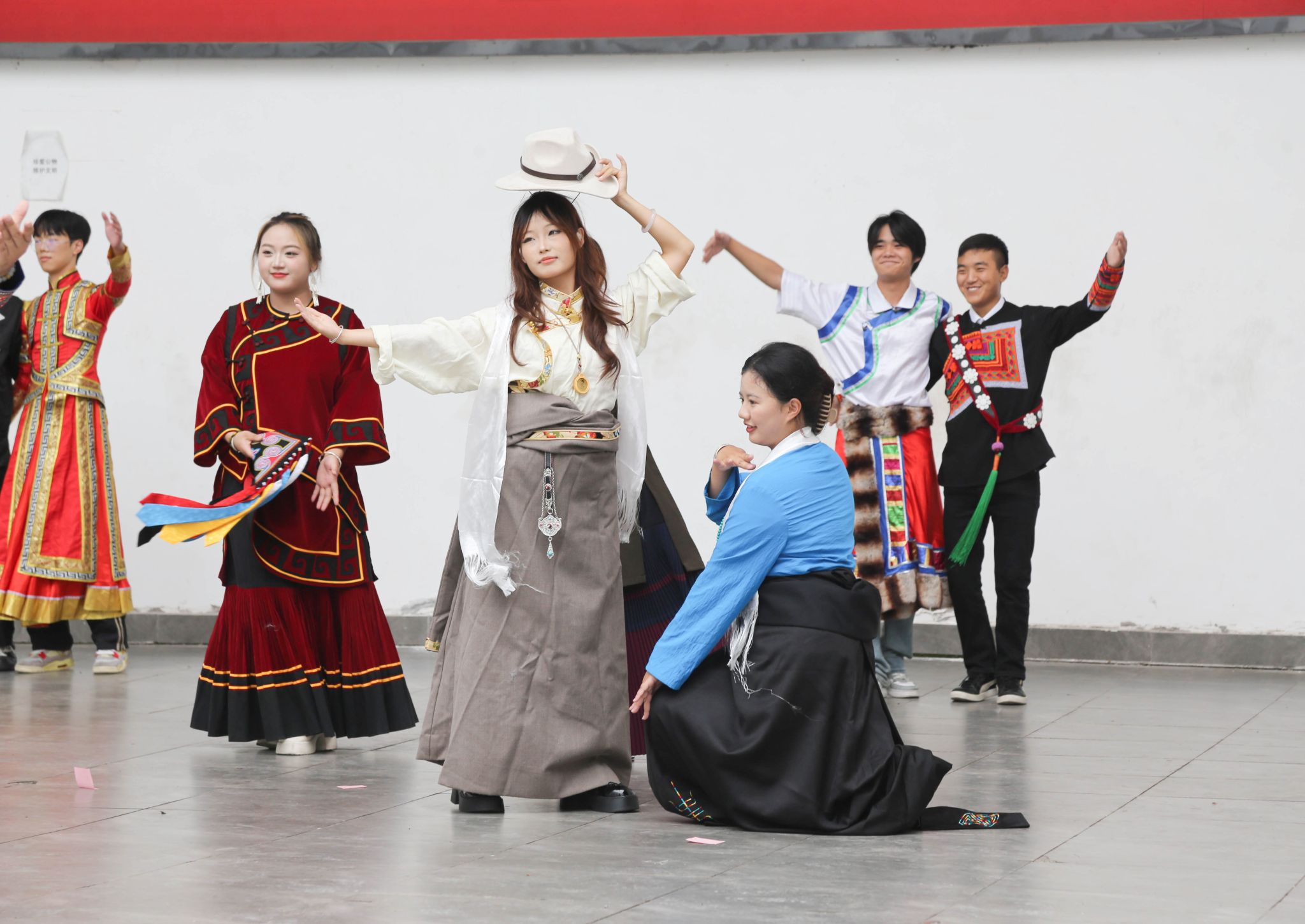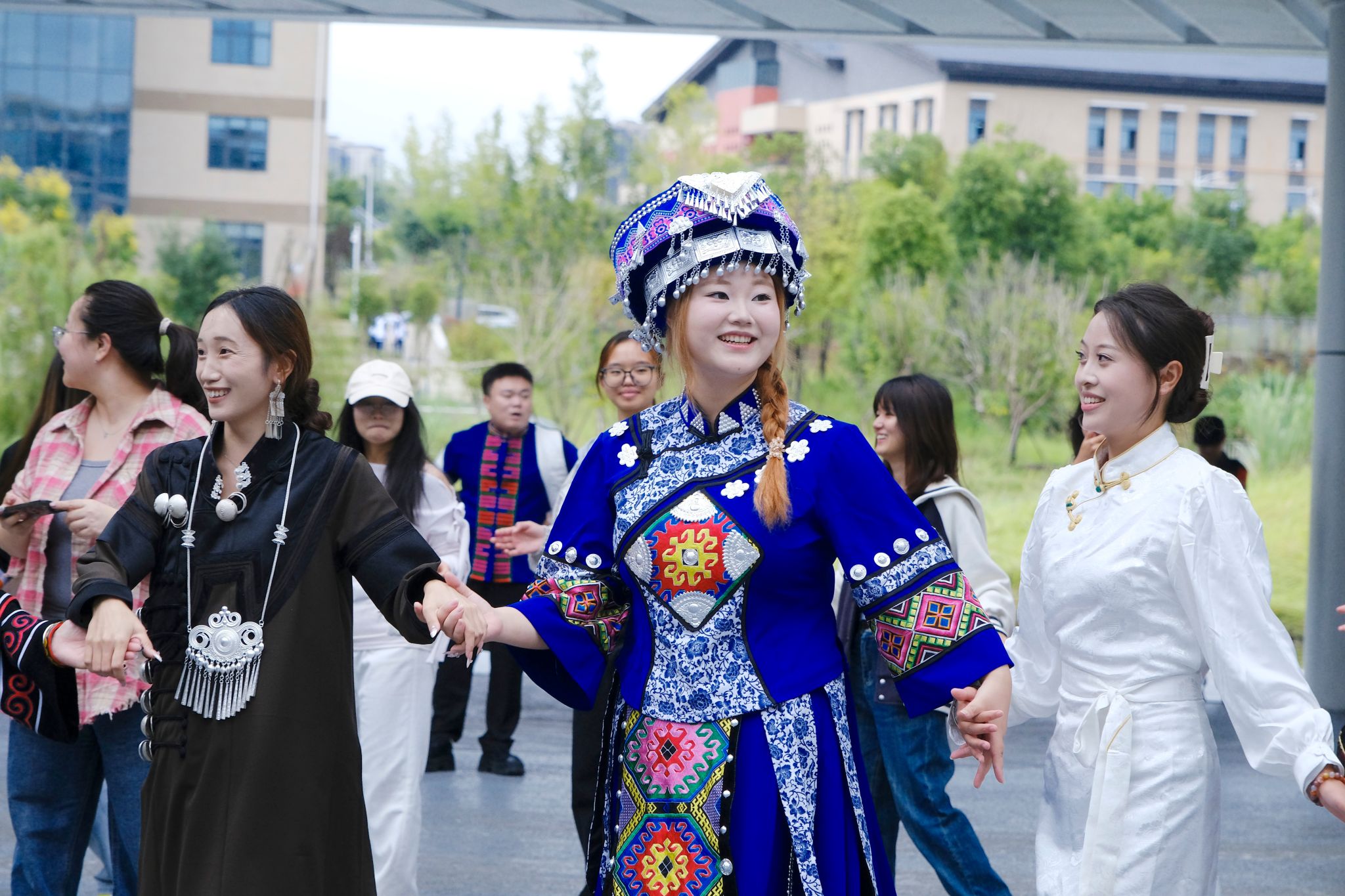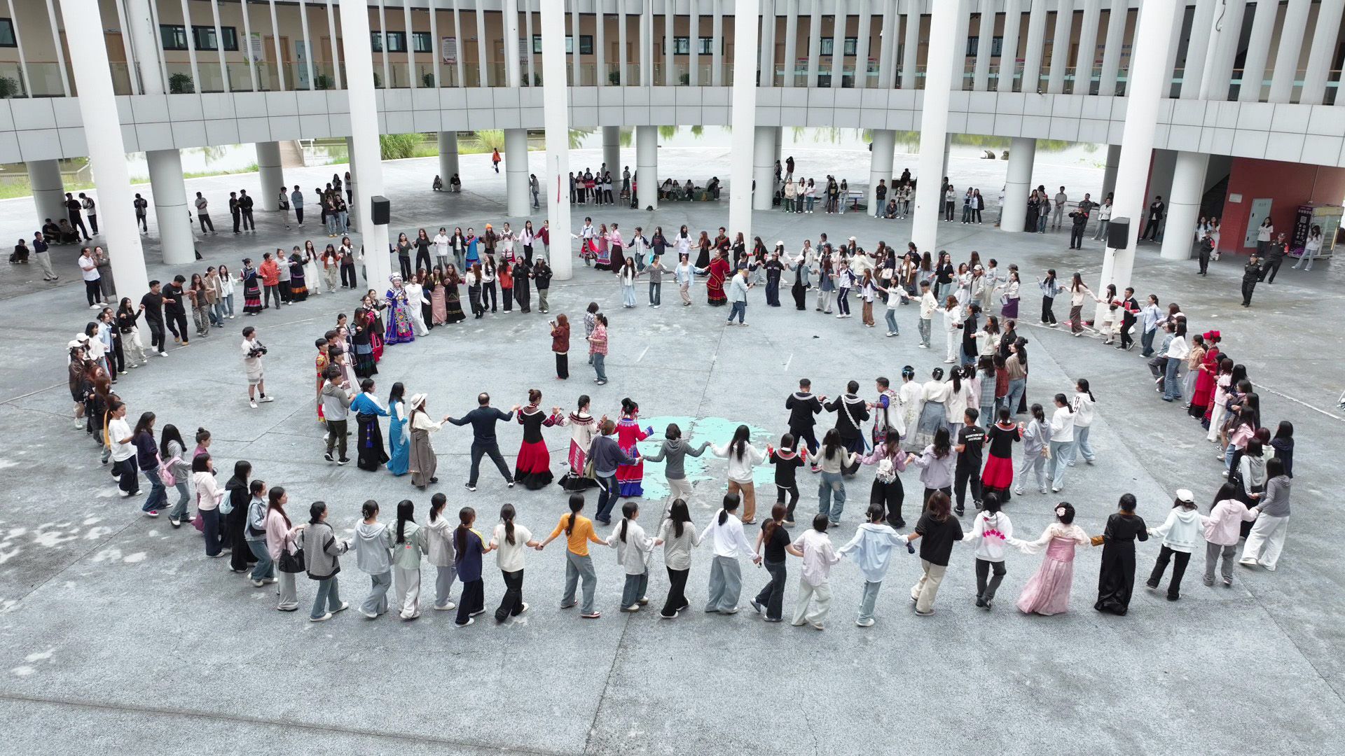 启动仪式上,同学们还带来了精彩的民族歌舞表演《爱我中华》和《博什瓦黑》等。活动最后,大家在广场上手拉手围成同心圆,共跳达体舞,欢快的舞步和悠扬的歌声展现了民族间的团结与活力。