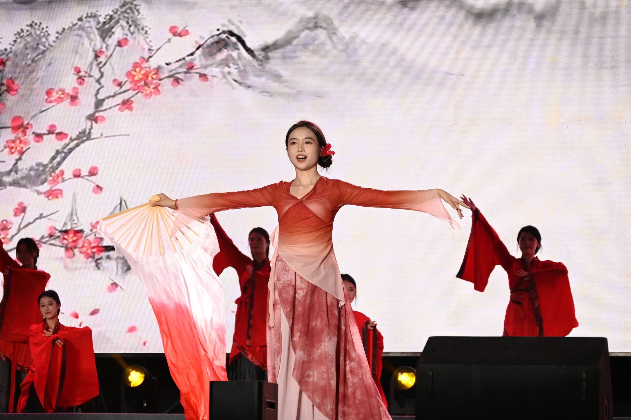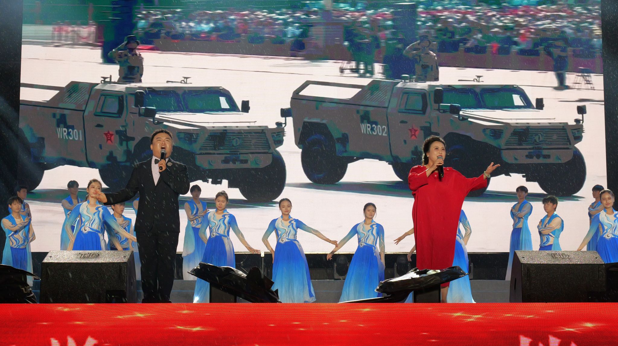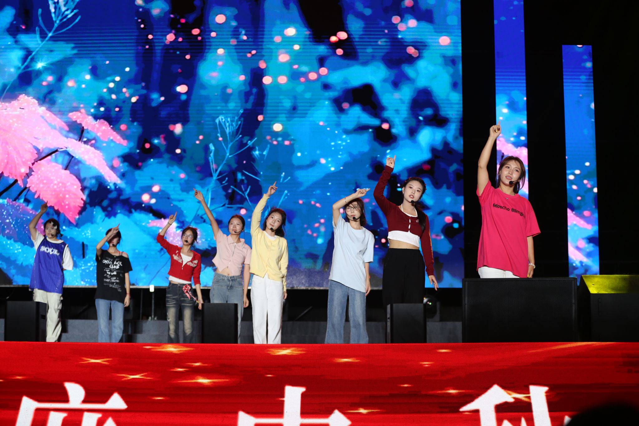 第一篇章“潮起桐梓”在开场舞《大漠沙海》中拉开序幕,舞姿刚柔并济,意境悠远;紧随其后的舞蹈《LIKE JENNIE》和管弦乐《青春VIVA》洋溢青春朝气,点燃全场热情;《唱支山歌给党听》《月下逢》《汉韵风华》等节目融合传统韵味与现代表达,展现文化传承与创新活力;“沱江学子说”则以铿锵誓言诉说内师青年的理想与抱负。第二篇章中,配音秀《你好,新“声”活!》、街舞《有的是力气》等节目活力四射,歌曲《那些我尚未知道的美丽》传递积极向上的信念,舞蹈《一个都不能少》讲述支教故事,《青马学员说》则号召青年在实践中淬炼成长。第三篇章《山河》献礼抗战胜利80周年,《鎏金年代》模特秀尽展青春风采,《叶脉成画》《峨眉武魂》彰显非遗文化与武术魅力,尾声《我们的新时代》唱响奋进之志,凝聚青春力量。