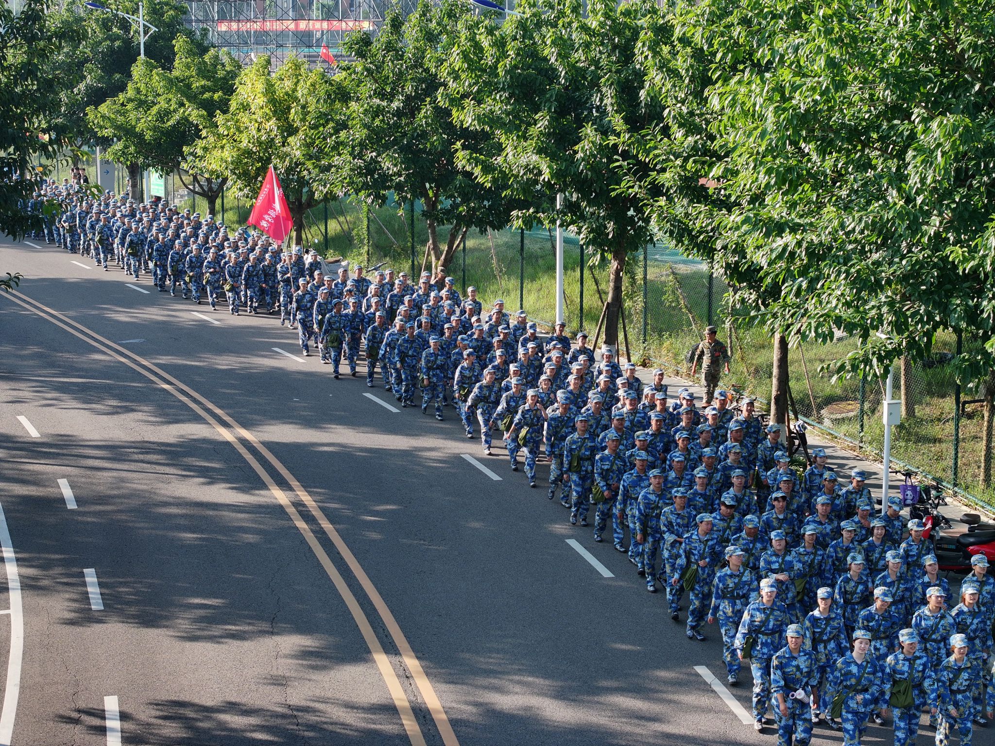 8点30分,全体军训新生、军训教官在田径场集合完毕。随着指令下达,拉练队伍迈着整齐的步伐有序启程。行军中,同学们步伐铿锵一致,嘹亮的口号声此起彼伏,响彻沿途。同学们还在各队连长带领下高唱军歌,展现出昂扬的士气。