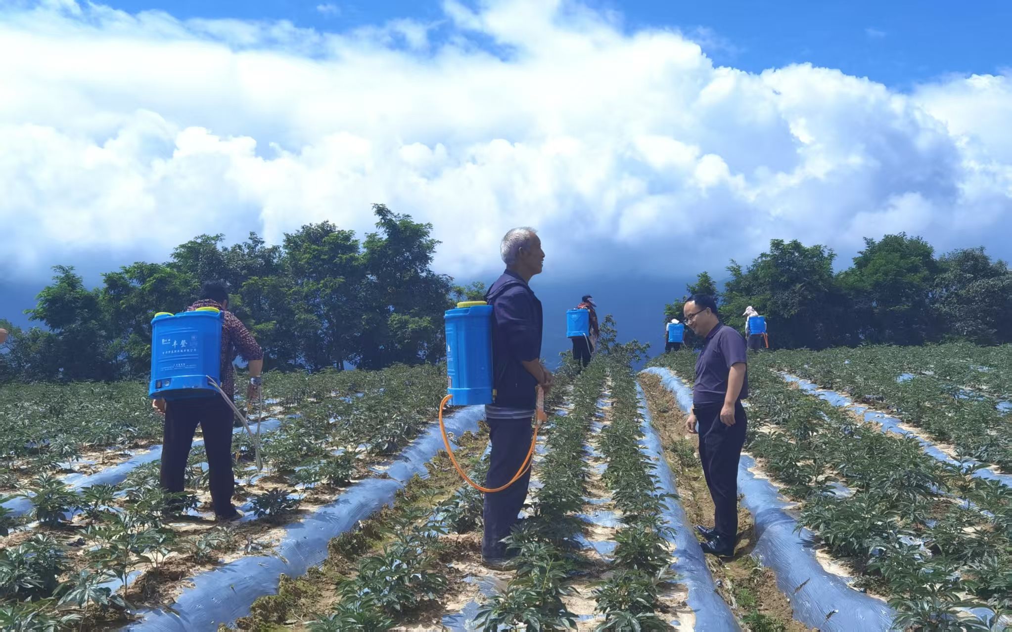 村民正在为芍药花施叶面肥