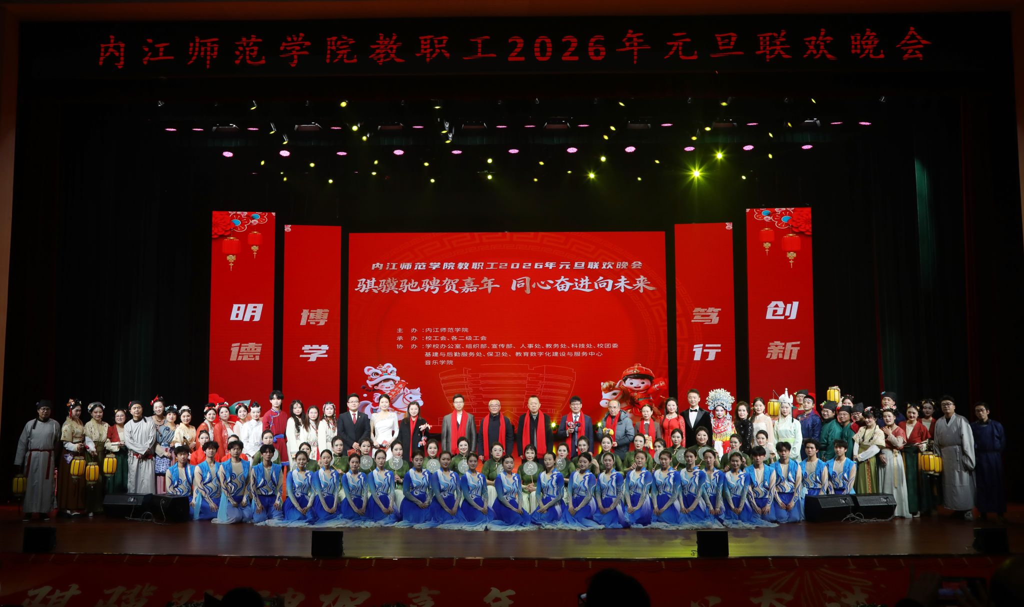在2026年新春将至、建校70周年来临之际,学校于12月30日晚在苌弘剧院举办“骐骥驰骋贺嘉年,同心奋进向未来”教职工元旦联欢晚会。校党委书记黄永忠,校党委副书记、校长郭云东等全体校领导,离退休老同志代表,各党政群教辅科研单位、二级学院负责人和教职工欢聚一堂,共贺新春,喜迎建校70周年与“十五五”规划开局之年。