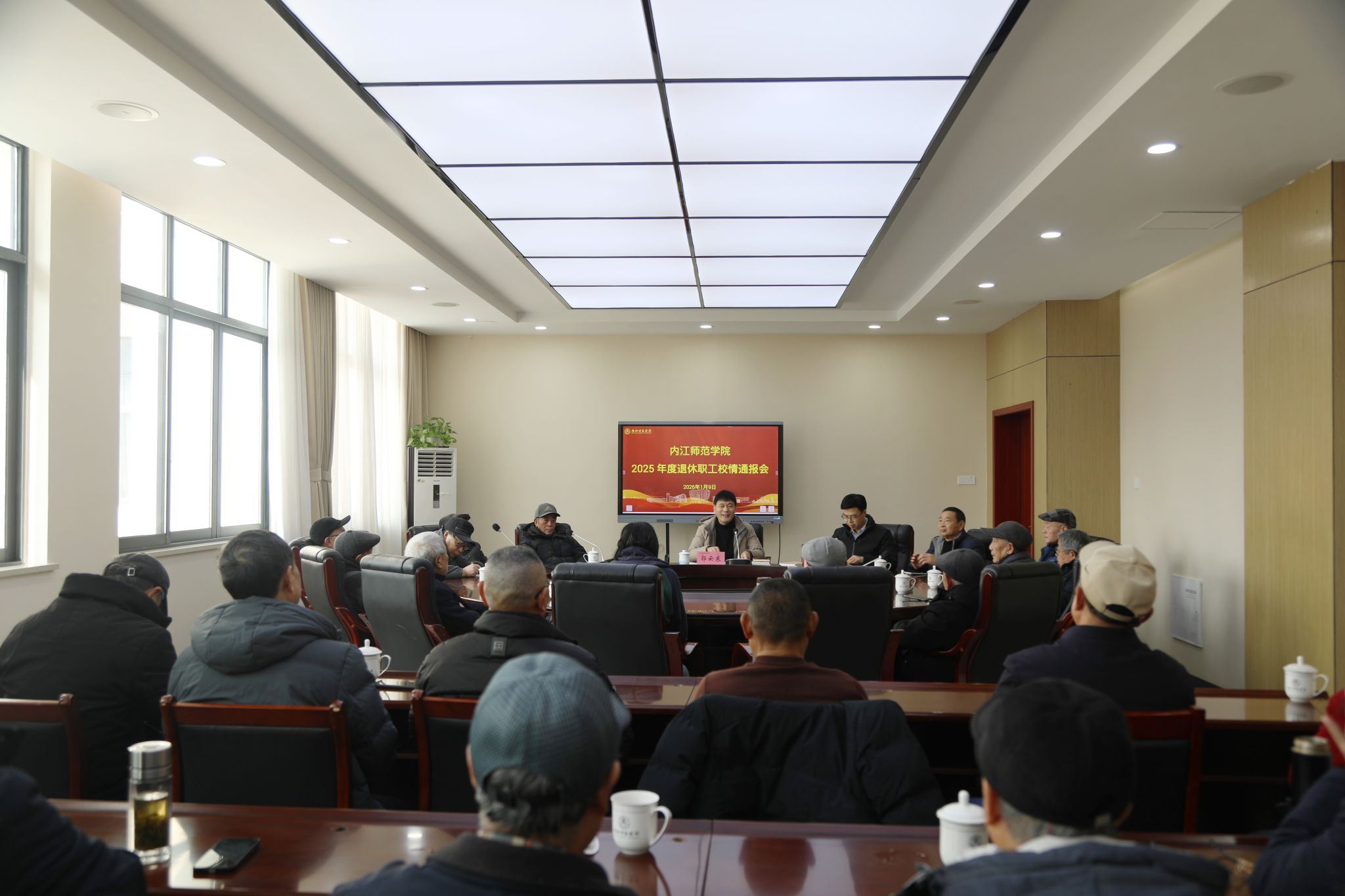2026年1月9日下午,学校在行知楼B206会议室召开2025年度退休职工校情通报会。学校党委副书记、校长郭云东,党委副书记胡金朝,相关职能部门负责人与近40名退休职工代表齐聚一堂,共话发展、同叙情谊。会议由胡金朝主持。