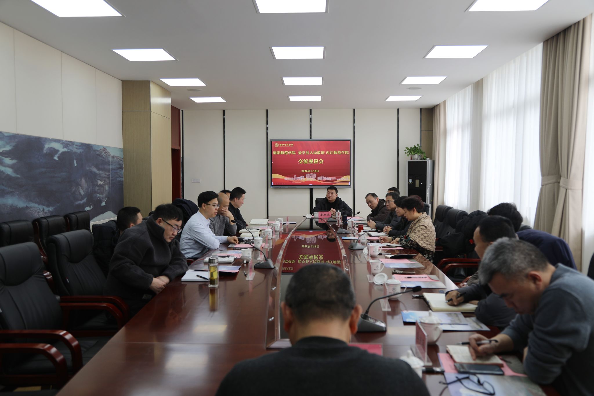 1月8日下午,绵阳师范学院党委副书记罗娅君与盐亭县委常委、县人民政府副县长谷业非一行来校考察交流。座谈会在行知楼B202会议室举行,我校党委副书记胡金朝主持会议。