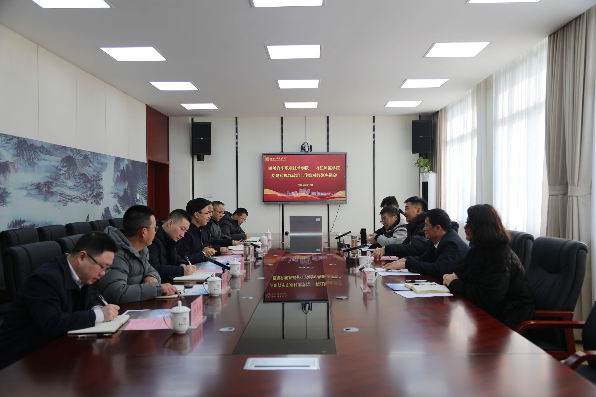 根据省委教育工委、省委组织部统一部署,内江师范学院与四川汽车职业技术学院正式启动为期五年的党建和思想政治工作结对共建。 2026年1月12日上午,两校共建座谈会在我校行知楼B101举行。四川汽车职业技术学院董事长、校长邓斌一行到校交流,我校党委副书记胡金朝出席。会议由胡金朝主持。