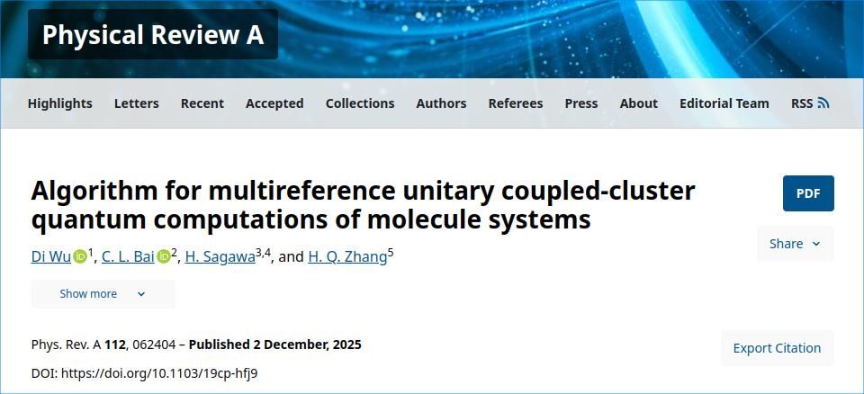 近日,我校物理与电子信息工程学院青年教师吴迪博士与四川大学、日本理化学研究所、中国原子能科学研究院等合作单位共同提出了一种基于量子计算的高效多参考态幺正耦合簇(MR-UCC)算法,相关成果以“Algorithm for multireference unitary coupled-cluster quantum computations of molecule systems”为题,发表于国际知名物理期刊《Physical Review A》,内江师范学院为第一完成单位。