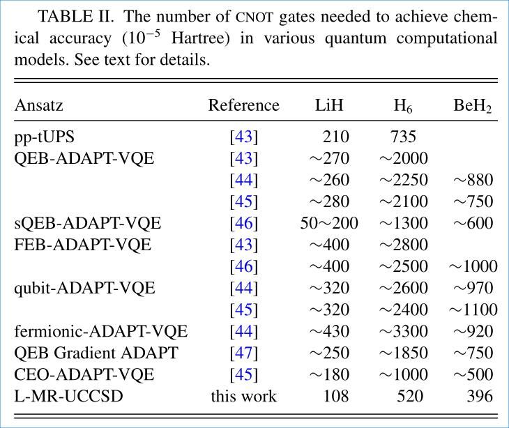 研究团队以LiH、BeH₂和H₆分子为测试体系,在STO-3G基组下验证了算法的优越性能。结果显示,该算法在达到相同计算精度时,所需CNOT门数量显著少于目前主流变分量子本征值求解器模型,展现了良好的资源效率与扩展潜力。