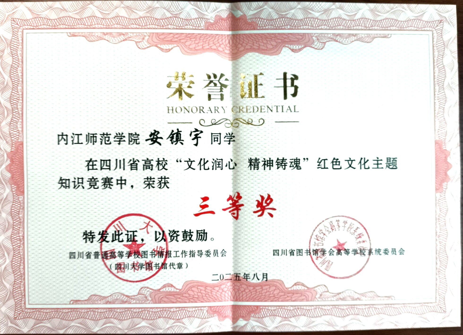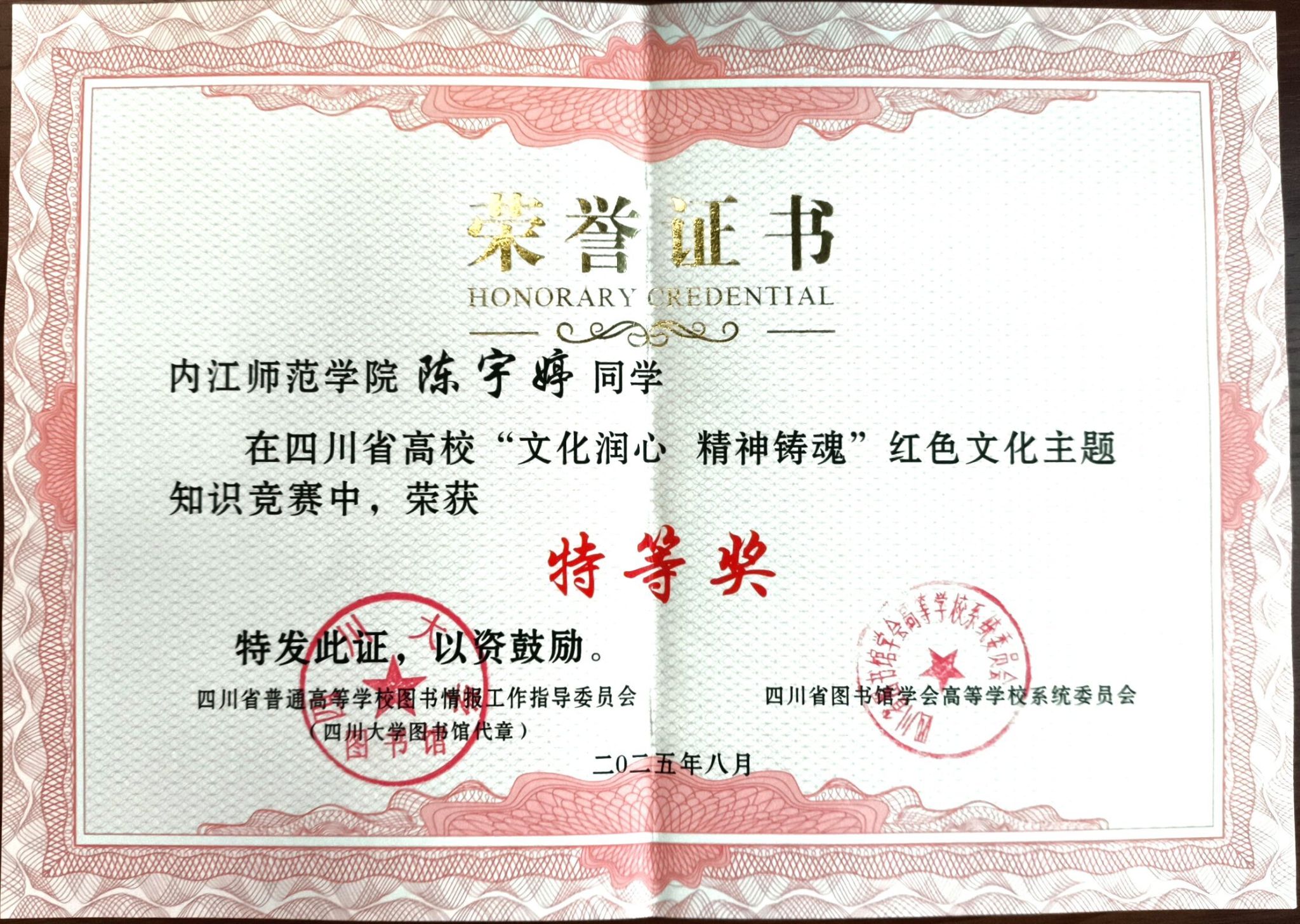 近日,四川省高校“文化润心 精神铸魂”红色文化主题知识竞赛结果揭晓。我校政治与公共管理学院陈宇婷同学的作品《红梅丹心照汗青——江姐精神里的文化传承密码》荣获全省唯一特等奖,安镇宇同学获三等奖,图书馆、档案馆、校史馆获评“最佳组织奖”,全面展现了我校红色文化育人成效。