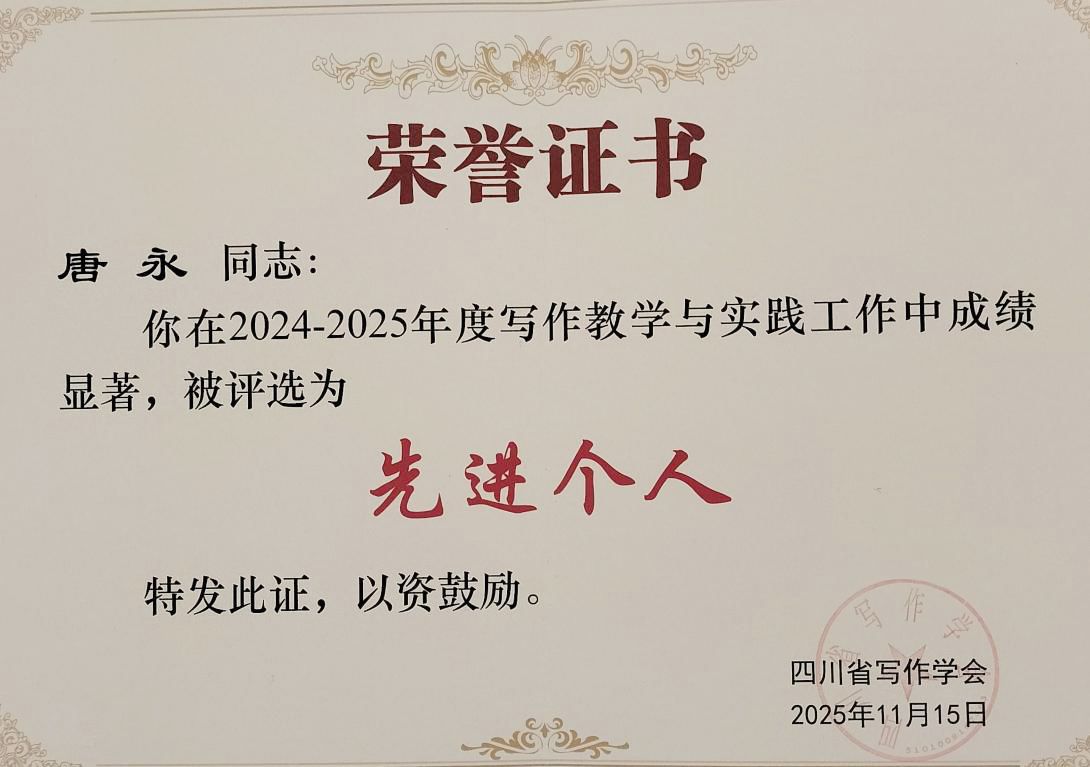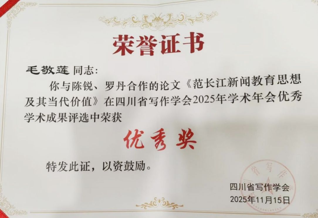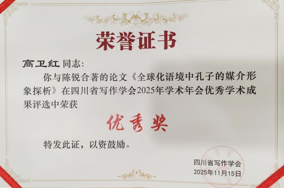 11月15日,四川省写作学会2025年学术年会暨优秀成果颁奖大会在电子科技大学沙河校区举行。我校文学与创意写作研究中心获“先进集体”称号,1名教师获评“先进个人”荣誉称号,2项学术成果获“优秀奖”。