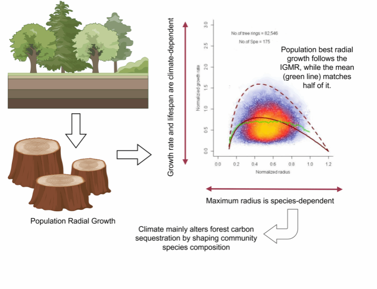 该项研究基于全球4000余条树轮年表数据,通过长期系统分析,在森林生态演变规律研究方面取得重要突破。研究发现,尽管单株树木因基因、气候和林分结构差异而呈现复杂多变的生长路径,但在种群尺度上,树木径向生长表现出显著且稳定的收敛规律——种群平均径向生长趋势大致遵循理论“最优生长轨迹”的一半。进一步分析表明,气候变化与林分结构的不均一性主要驱动树木生长速率发生“漂移”,而非改变树木可达到的最大半径。这表明,外部环境变化对森林种群生长模式的影响更多体现在速率的空间—时间偏移,而非个体树木潜在大小的改变。