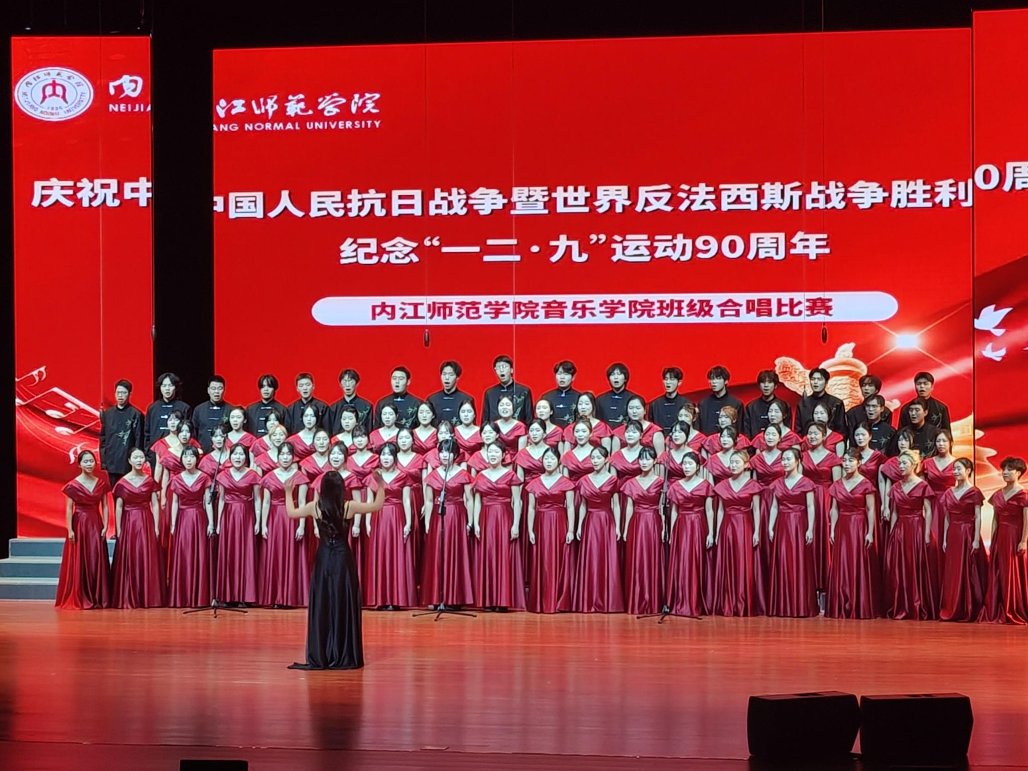 在“一二·九”运动90周年之际,音乐学院组织全院23个班级举办合唱比赛,以经典红歌为载体,围绕纪念“一二·九”运动及中国人民抗日战争暨世界反法西斯战争胜利80周年主题展开,在艺术实践中传承民族精神,传递爱国情怀。