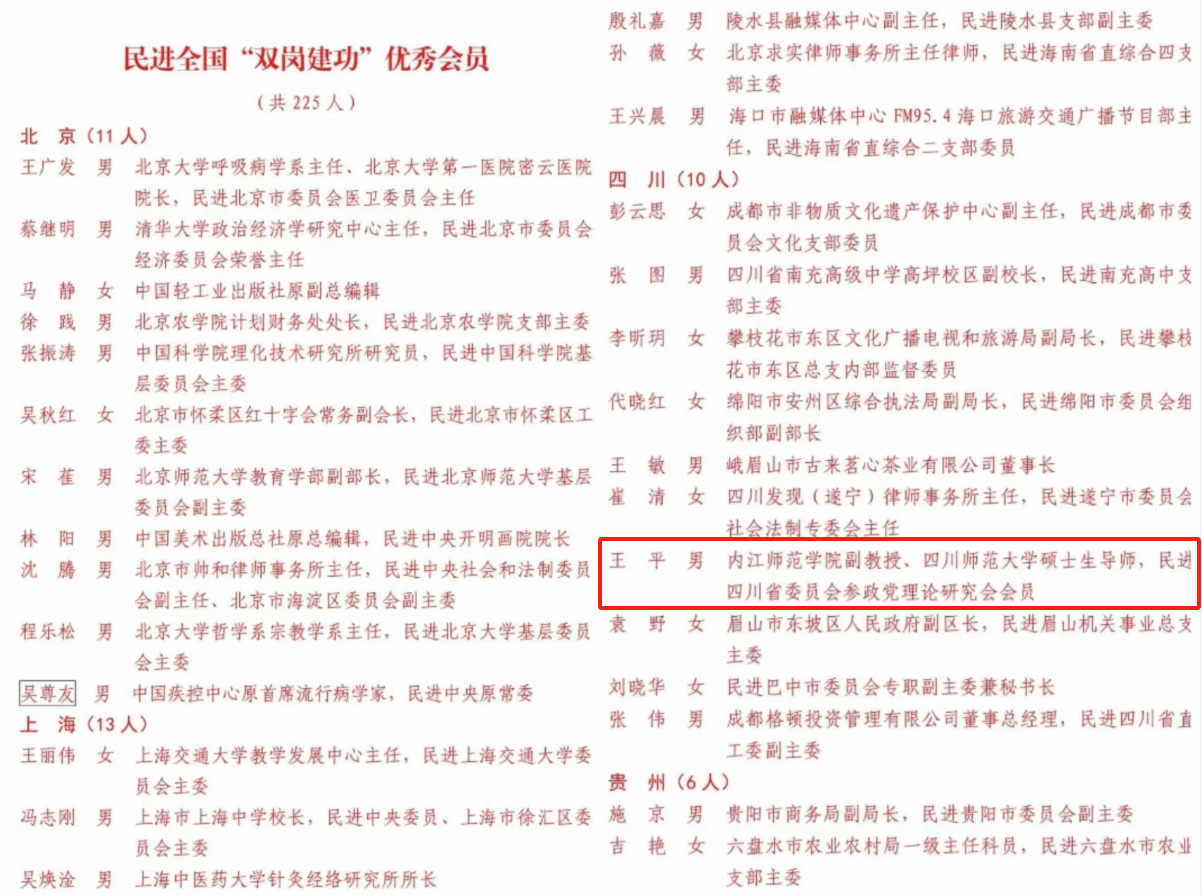 我校民进支部主委、张大千研究中心专职研究员王平,凭借在参政党理论研究和参政议政方面的突出表现,荣获民进中央“民进全国‘双岗建功’优秀会员”和“民进全国会史工作先进个人”两项荣誉称号。王平主持的民进中央理论研究课题成果《民进各领域代表人士生平研究:刘西林评传》获得民进中央“民进全国会史研究优秀成果”表彰。
