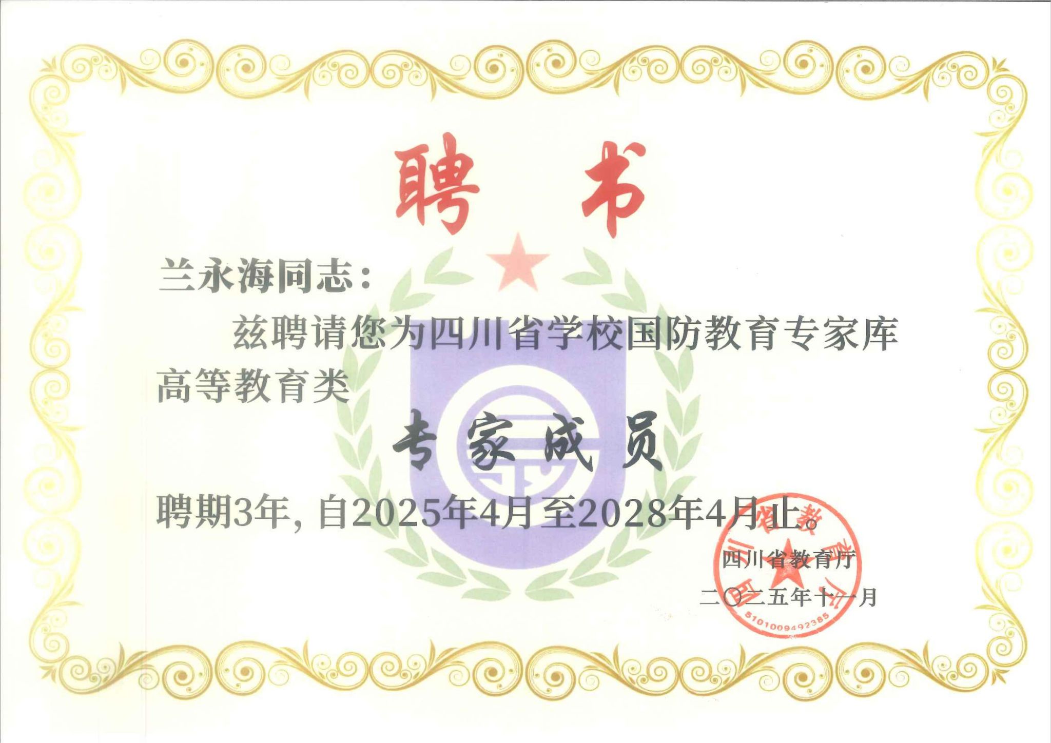 兰永海是国家国防教育师资库首批入库专家、四川省首批学校国防教育专家库专家、四川省教育厅军事理论课骨干教师巡回授课团成员,累计开展相关宣讲300余场,在国防教育与党的创新理论宣讲方面经验丰富、成果丰硕。
