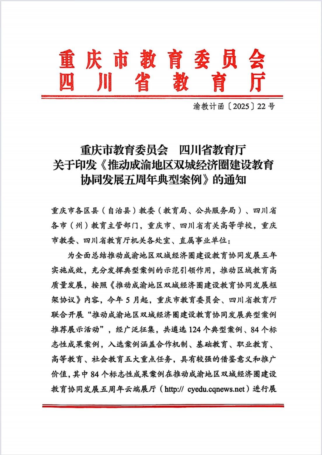 本次评选旨在总结成渝地区教育协同发展五年成效,选树具有示范价值的实践案例。经广泛征集与严格评审,共评选出典型案例124个、标志性成果84个,涵盖合作机制、基础教育、职业教育、高等教育与社会教育五大领域,具有较强的借鉴意义和推广价值。