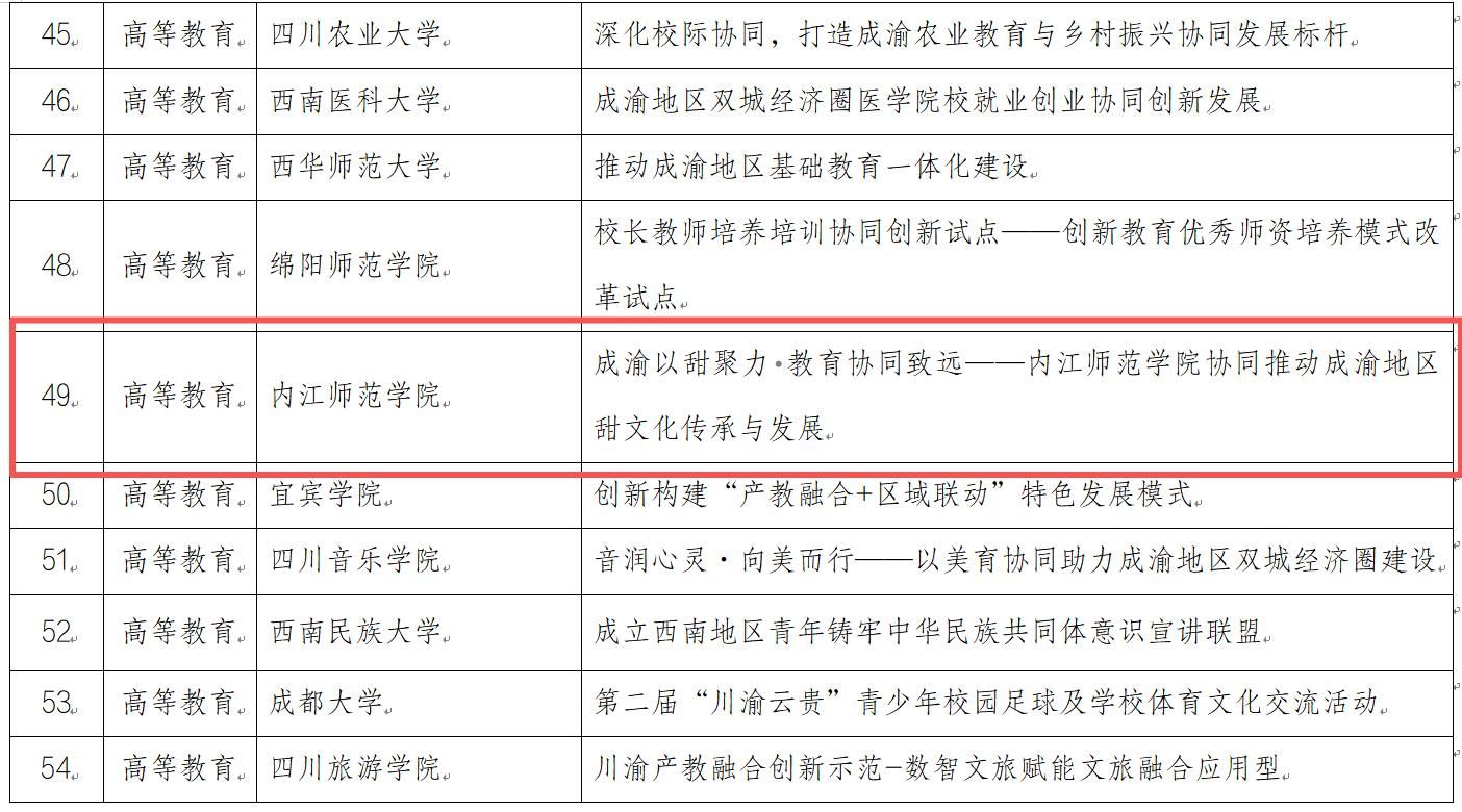 近日,重庆市教育委员会、四川省教育厅联合评选的《推动成渝地区双城经济圈建设教育协同发展五周年典型案例》结果揭晓,由学校政策法规处、合作交流处牵头,法学与历史文化学院主持申报的《成渝以甜聚力 教育协同致远——内江师范学院协同推动成渝地区甜文化传承与发展》成功入选。