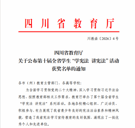 近日,四川省第十届“学宪法 讲宪法”活动获奖名单公布。我校学子表现优异,获二等奖2项,三等奖1项。