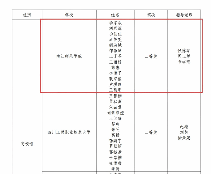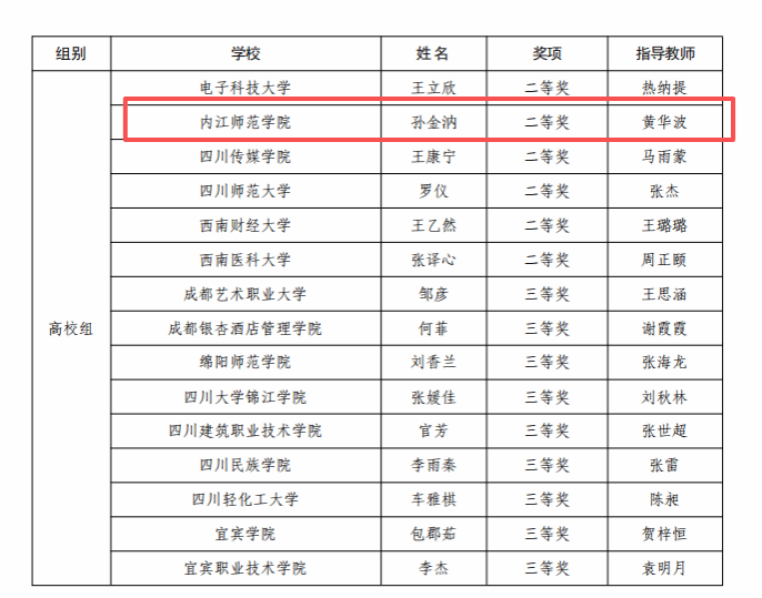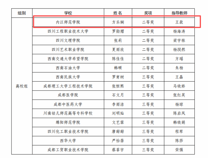 我校范长江新闻学院学生方乐娴(指导老师:王款)获得高校组演讲比赛省级决赛二等奖,法学与历史文化学院学生孙金汭(指导老师:黄华波)获得高校组法治素养竞赛省级决赛二等奖,由李宗政、刘思源、李佳佳等13名(指导教师:侯德苹、周玉娇、李宇璟)学生创作演绎的作品获得高校组法治情景剧比赛三等奖。