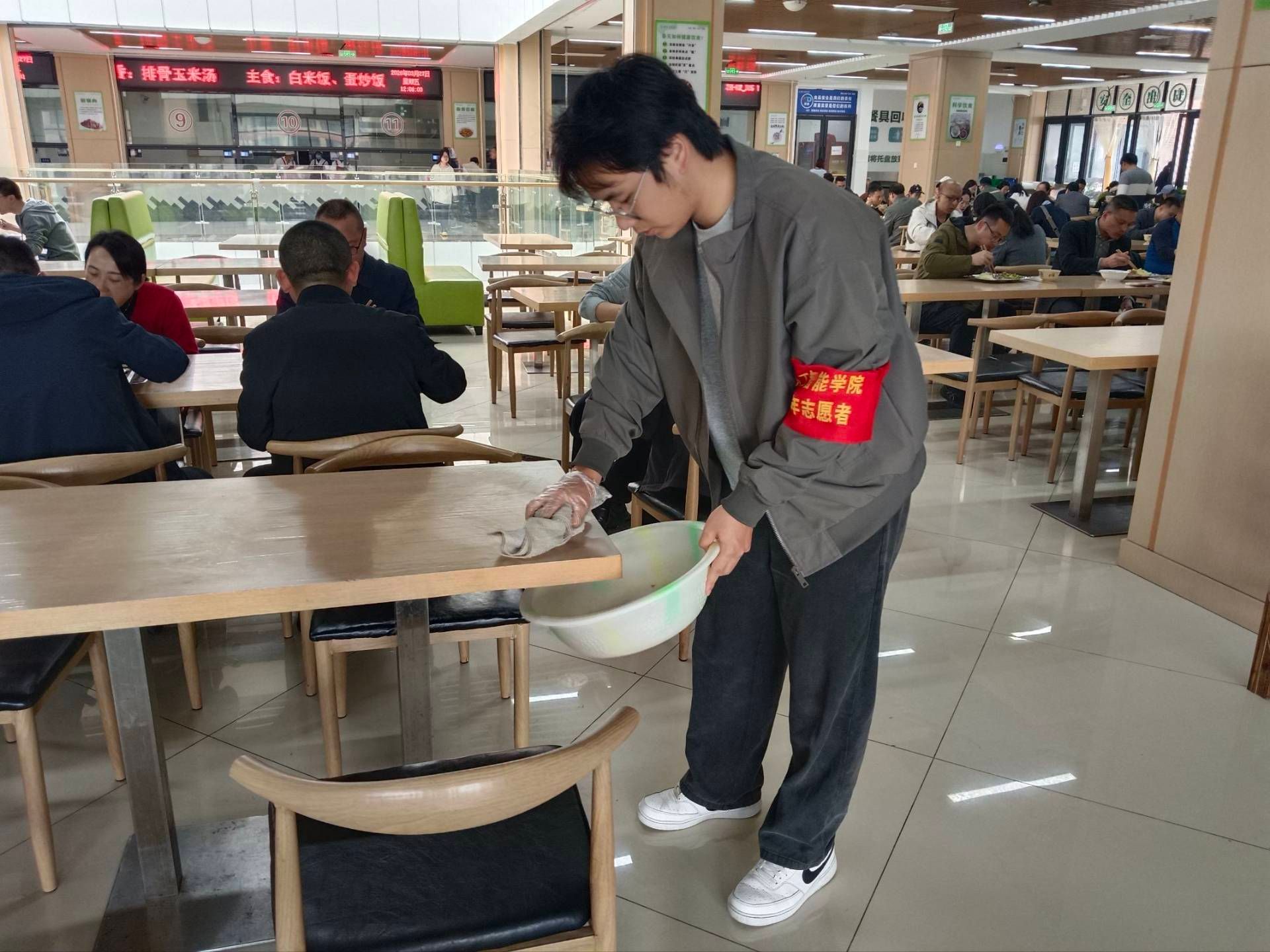 共建文明校园:点滴行动擦亮文明底色。志愿者在食堂维护秩序、倡导“光盘行动”,在图书馆整理书籍、清洁环境,在校园各区域开展义务保洁,重点清理道路及灌木丛垃圾,多支队伍协同规整共享电动车停放。