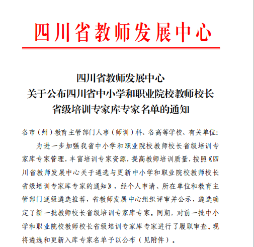 近日,四川省教师发展中心公布最新一批四川省中小学和职业院校教师校长省级培训专家库名单,我校36名教师成功入选,覆盖基础教育、职业教育、综合培训等多个领域,彰显学校在教师培训、教育科研与学科教学方面的专业影响力。