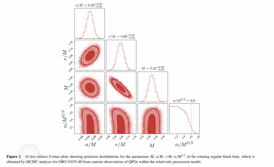 黑洞物理是当前理论物理领域的前沿研究方向,对探索引力本质、量子引力理论具有关键意义。研究团队选取了GRO J1655-40等五个X射线双星系统的观测数据,运用马尔可夫链蒙特卡罗方法进行拟合分析,对旋转规则黑洞进行参数限制,最终得到量子效应参数α/M^(2/3) < 0.60(95%置信度)的约束结果。这一结果较此前静态规则黑洞的研究精度显著提升,为旋转规则黑洞的理论模型提供了更为严格的观测限制。此外,研究还揭示了量子效应对黑洞周围物质陀螺进动频率的抑制作用,为检验量子引力理论提供了新的观测途径和理论依据。