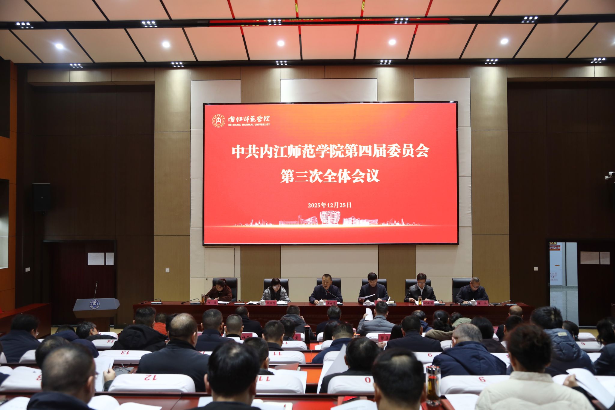 2025年12月25日,中国共产党内江师范学院第四届委员会第三次全体会议在行知楼B104举行。校党委书记黄永忠主持会议并代表常委会作工作报告。黄永忠以《坚持党建引领 科学擘画“十五五” 加快推进高水平师范大学建设》为题作工作报告。报告系统总结了过去一年学校在党建思政、学科建设、科学研究、人才培养...